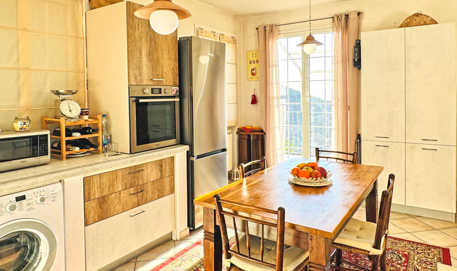 La cucina, aperta sul soggiorno, è pronto per ospitare ricette di famiglia o piatti da gustare nella veranda esterna, immersi nella quiete del giardino.